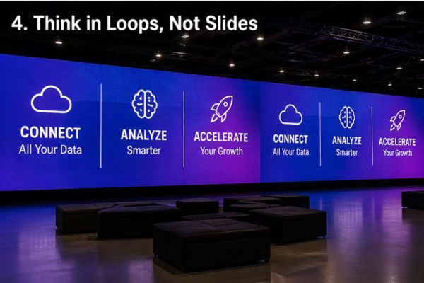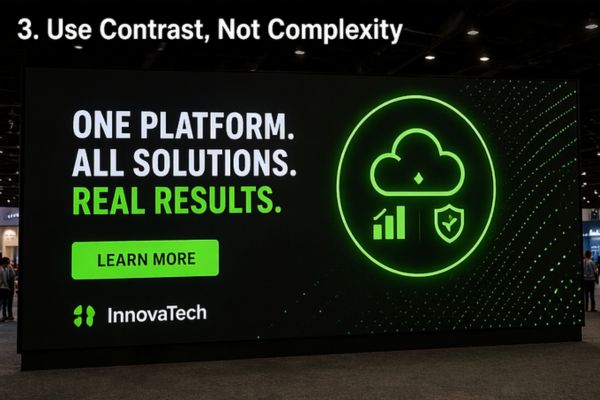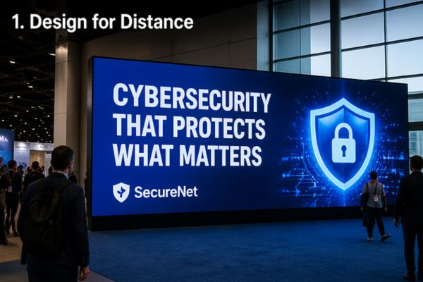 LED displays are powerful because of their size, but that only works if the content is designed for distance. Attendees often view screens from across aisles, while walking past, and at an angle.